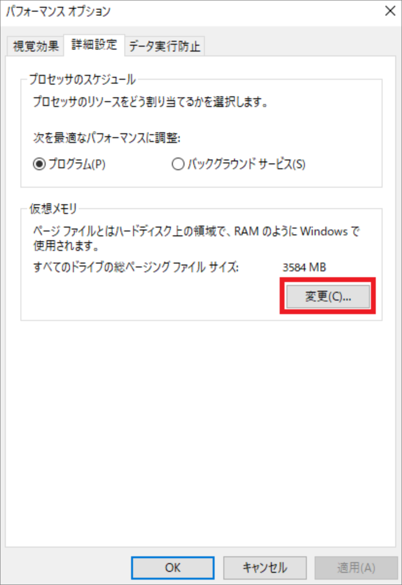 - 「パフォーマンス オプション」ウィンドウで「詳細設定」タブを選択し、「仮想メモリ」の下にある「変更」ボタンをクリックします。