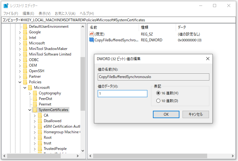 - 値の名前に新しい名前「CopyFileBufferedSynchronousIo」を付けます。