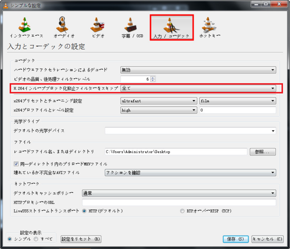 - 次に、VLCで「ツール」-「環境設定」-「入力 / コーデック」を順番にクリックします。選択した設定プロファイルを編集し、「コーデック」セクションの「H.264エンコードループ内のブロック効果フィルタをスキップ」の値を「すべて」に変更し、その後「保存」ボタンをクリックします。