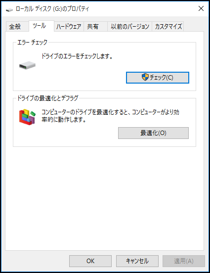 - ドライブのプロパティウィンドウで「ツール」タブをクリックし、エラーチェックの「チェック」ボタンを押します。